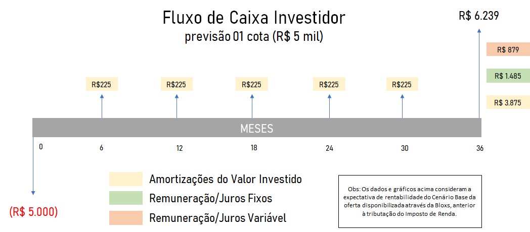 O valor investido será pago em parcelas semestrais, com a remuneração/juros pagos ao final.. O Contrato de Investimento considera uma Remuneração Fixa e Remuneração Variável, esta sendo um % do faturamento acumulado da Sociedade Investida ao longo dos 03 anos de vigência.