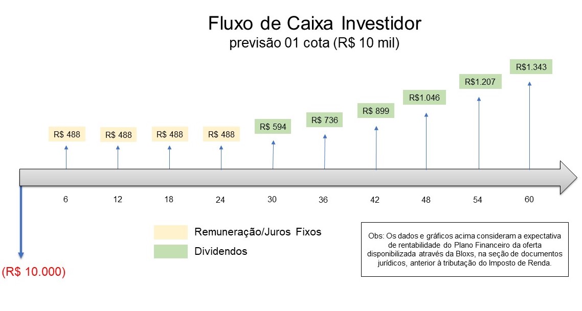 Os valores eventualmente retidos e recolhidos serão discriminados em Informe de Rendimentos individual, disponibilizado na Bloxs anualmente. Os valores serão retidos pela SOCIEDADE EMPRESÁRIA antes dos pagamentos aos investidores. Como padrão de todos os investimentos e aplicações financeiras, a rentabilidade informada nesta oferta é anterior à eventual tributação pelo Imposto de Renda.