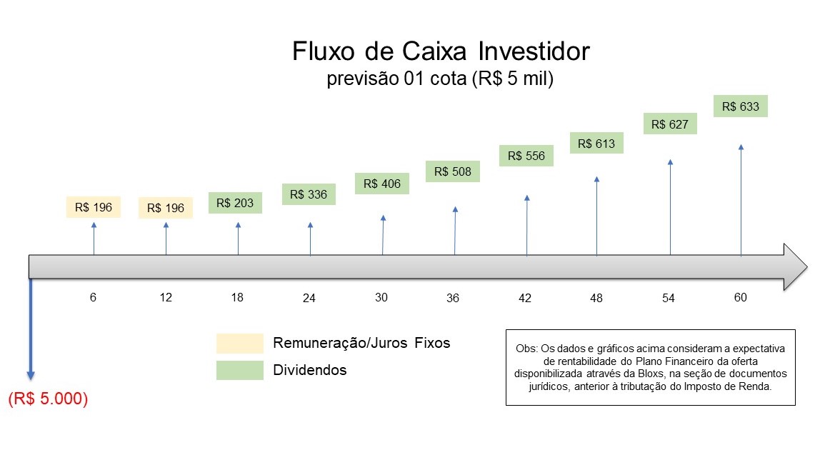 Os valores serão retidos pela SOCIEDADE EMPRESÁRIA antes dos pagamentos aos investidores. Os valores retidos e recolhidos serão discriminados em Informe de Rendimentos individual, disponibilizado na Bloxs anualmente. Como padrão de todos os investimentos e aplicações financeiras, a rentabilidade informada nesta oferta é anterior à tributação pelo Imposto de Renda.